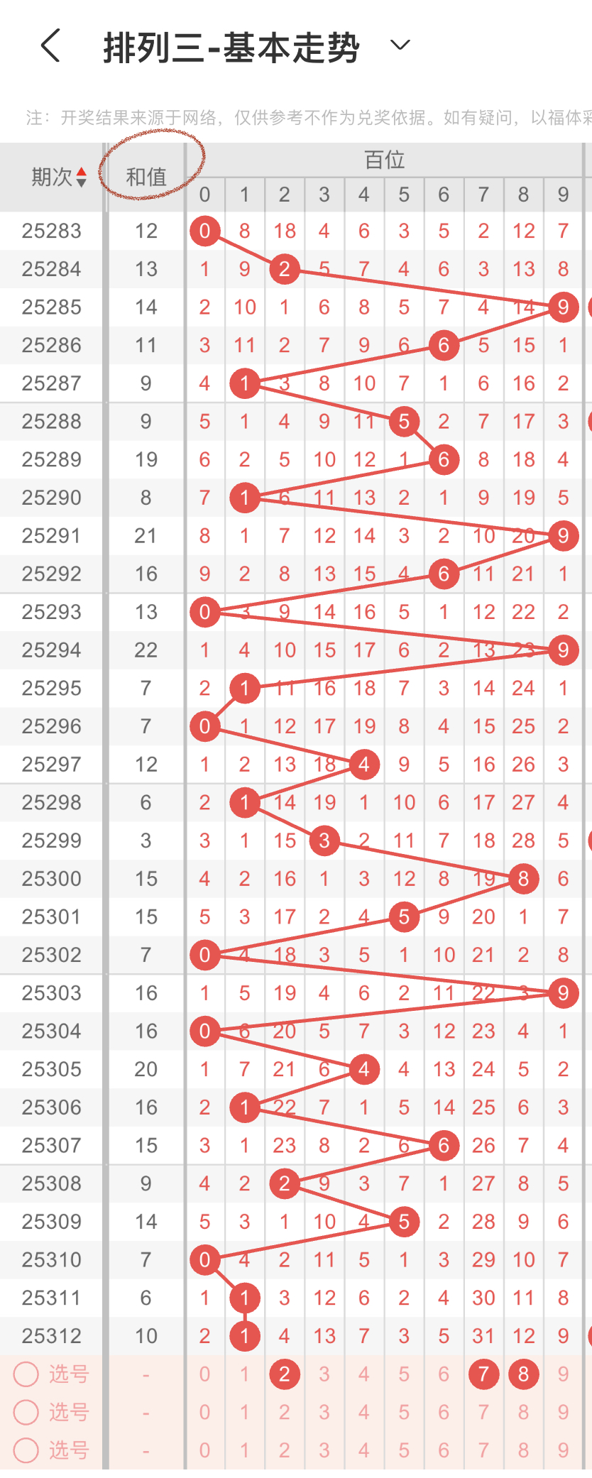 结合上面的大小、奇偶以及012路比,我们可以得到的数据分别是第一组01234,第二组02468,第三组258,我们重点选择3组数据中重复的,那百位我们选择2,防2路的8,防1路的7,综上所述百位选278