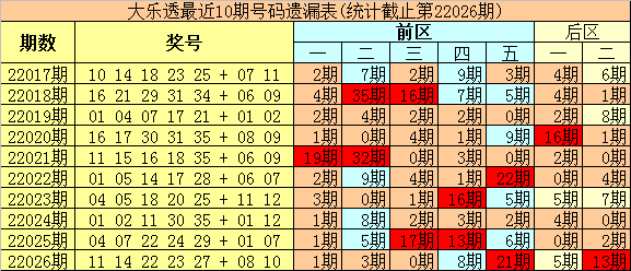 开奖回顾:大乐透第22026期奖号为:11 14 22 23 27 + 08 10,前区号码大小比为3:2,和值为97,跨度为16,奇偶比为3:2。后区和值为18。