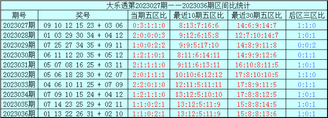 大乐透第2023036期奖号为:01、13、22、26、31 + 02、10。其中前区五区比为1:1:0:2:1,后区三区比为1:0:1。