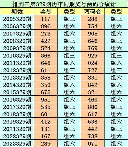在历年同期中两码合开出年限分别为:2出现7年,4、7出现6年,0、6、8出现5年,1、3出现4年,5、9出现3年,第2024329期预计两码合出现:1、2、5。