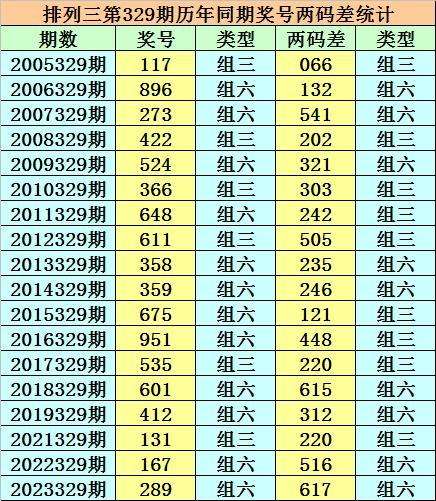 在排列三第329期历史同期开奖中,各号码两码差分别为:066、123、145、022、123、033、224、055、235、246、112、448、022、156、123、022、156、167;