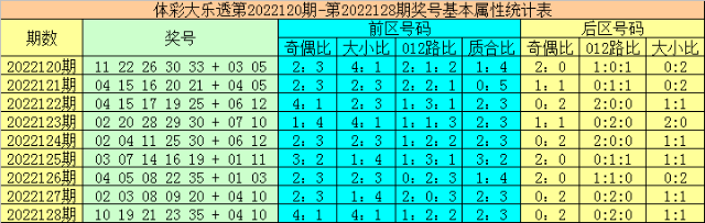 上期回顾:体彩大乐透第2022128期开奖号码为:10 19 21 23 35 + 04 10,其中前区号码奇偶比为4:1,大小比为4:1,012路比为1:2:2,质合比为2:3,后区号码奇偶比为0:2,012路比为0:2:0,大小比为1:1。