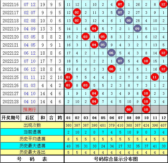 上期后区奖号:04和10,最近9期后区号码奇偶比为8:10,012路比为6:9:3,,本期后区参考号码04、08、09、10、12,后区两码关注08和10。