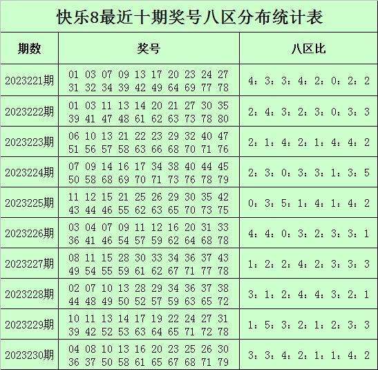 福彩快乐8第2023230期开奖回顾:04 08 10 13 16 20 23 25 26 30 36 37 50 58 61 65 67 68 71 79,其中奖号八区比为3:3:4:2:1:1:4:2。