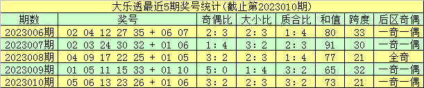 开奖回顾:体彩大乐透第23010期奖号为:05 06 13 23 26+01 06,前区奇偶比为3:2,大小比为2:3,和值为73,跨度为21,后区开出一奇一偶组合。