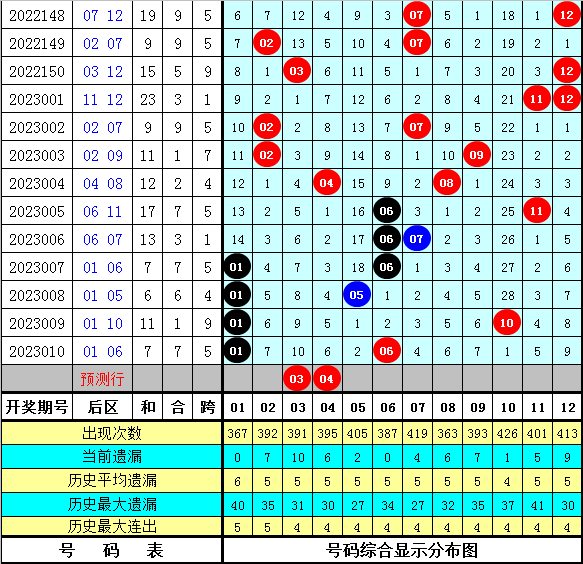 第2023011期后区奖号分析:后区最近五期开出奖号组合为:06+07、01+06、01+05、01+10、01+06,其中一奇一偶组合开出4次,全奇组合开出1次,全偶组合没有出现,本期后区关注一奇一偶组合,参考号码03、04。
