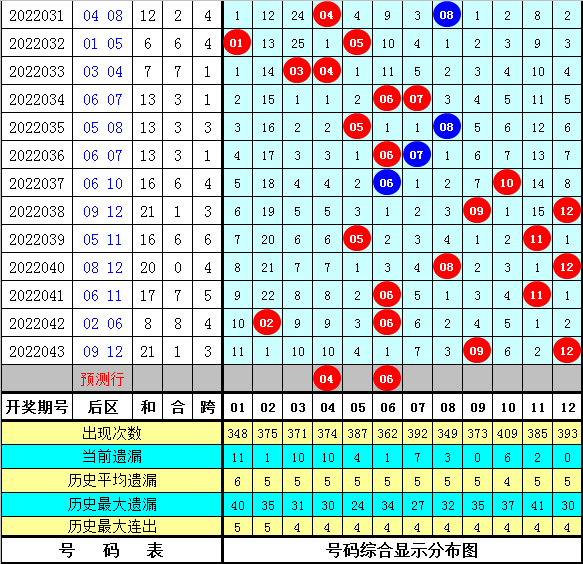 上期回顾:体彩大乐透第2022043期开出奖号为:02 16 17 24 30 + 09 12,其中前区各位奖号分别遗漏:8期、9期、5期、8期和12期,遗漏总值为42期,后区号码分别遗漏4期和2期,遗漏总值为6期。
