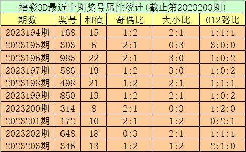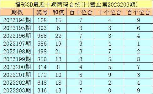 开奖回顾:第2023203期福彩3D奖号为346。奖号形态为组六,大小比为1:2,和值为13,奇偶比为1:2,012路比为2:1:0,跨度为3。