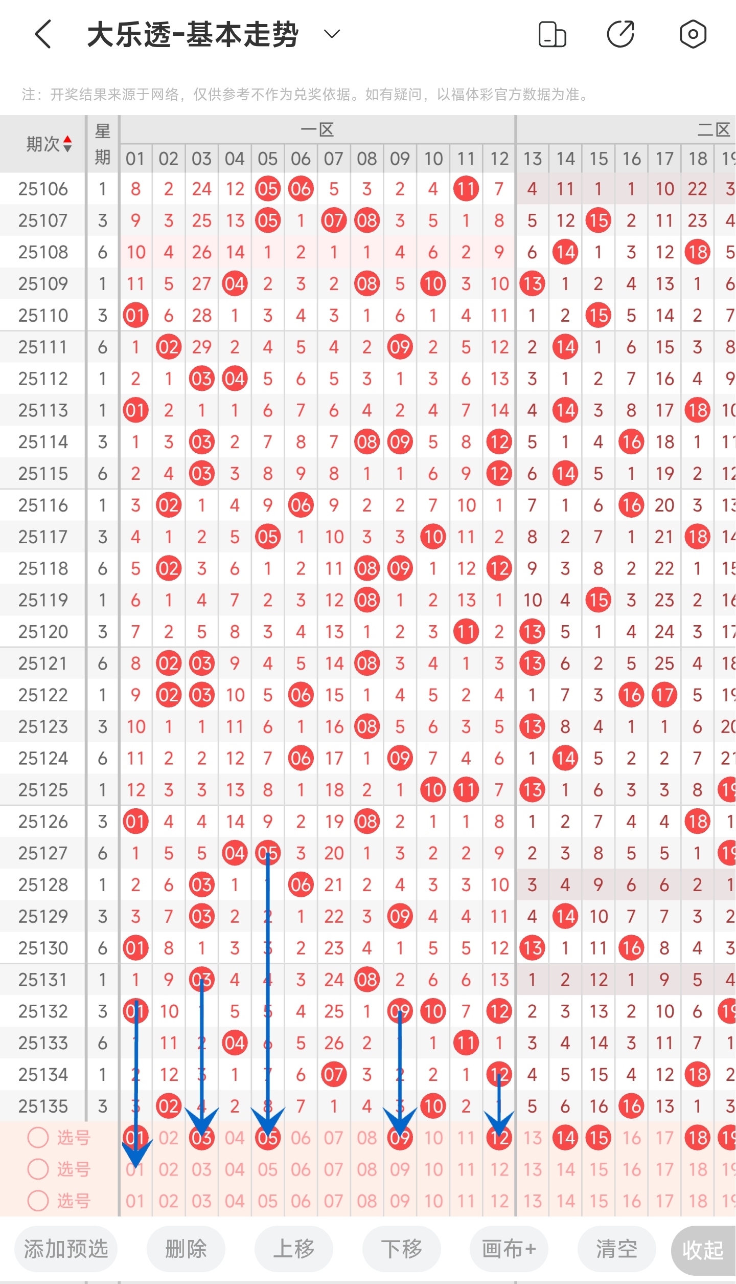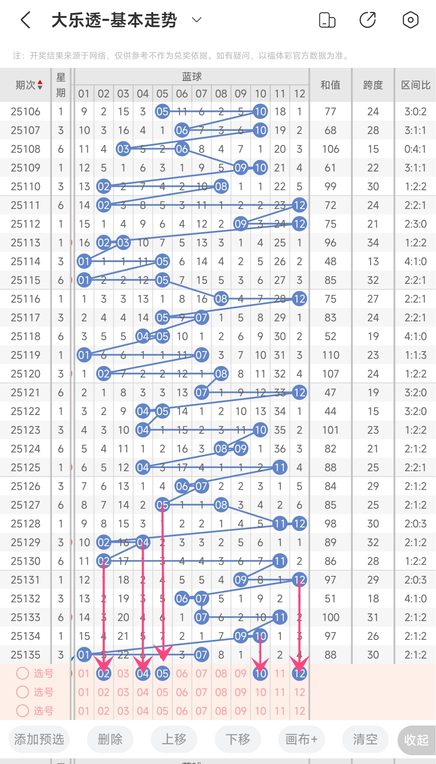 上期开出了1,7号球。往前一期开出了9,10号球。通过分析蓝区走势图,我们可以看到蓝区开出的号码跨度整体大多数情况下基本遵循一大一小这样子开。上期开了跨度比较大的号码。推测本期跨度大概率会变小,所以本期看好彼此跨度相差比较大的号码。然后再结合冷热号情况以及遗漏期数,本期我们可以关注2,4,5,10,12等号。综上所述本期我们推测可能开出2,4,5,10,12等号码。