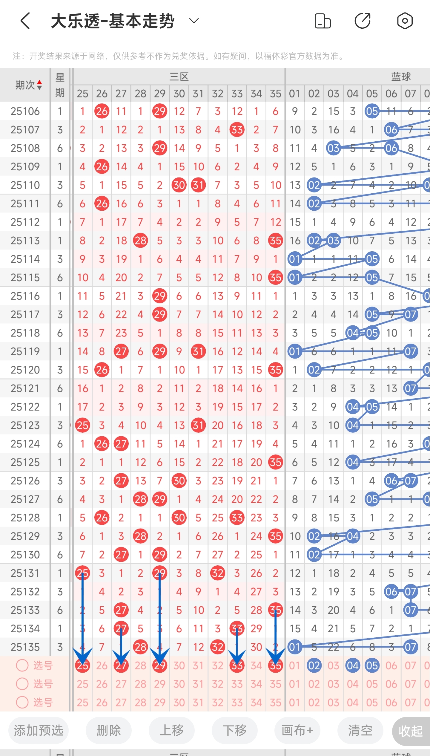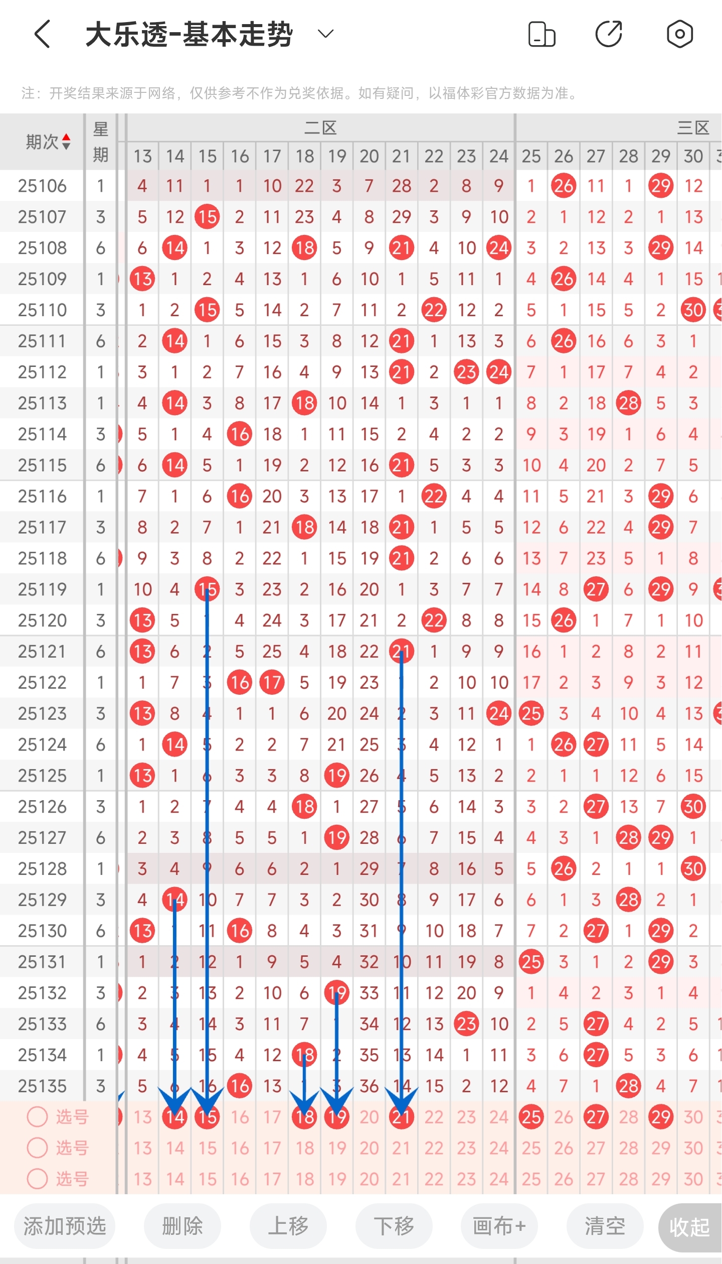 上期开出了28,32号球,往前一期开出了27,33号球。通过分析走势图,可以看到最近3区基本都是开2码,1左1右,本期我们也是主要关注左边和右边的号码,中间的话可以选择1或者2码防一下回归。关于凤尾,最近走势还是很稳定的,基本都在右边,本期看好33,35号球,可以防一下遗漏很久的34号球。最后再结合冷热号和遗漏期数,本期我们可以关注25,27,29,33,35等号。综上所述本期三区我们推测可能会开25,27,29,33,35等号码。