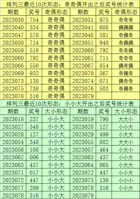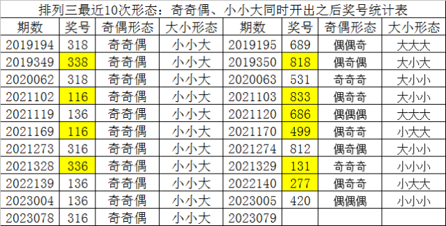 排列三最近10次同时开出奇偶形态:奇奇偶和大小形态:小小大时其奖号分别为:318-338-318-116-136-116-316-336-136-136-316,下期分别开出号码为:689-818-531-833-686-499-812-131-277-420,详细统计见下表: