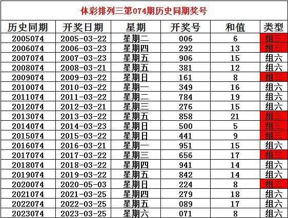 2024年3月24日排列三第074期开奖,历史同期分别开出奖号: