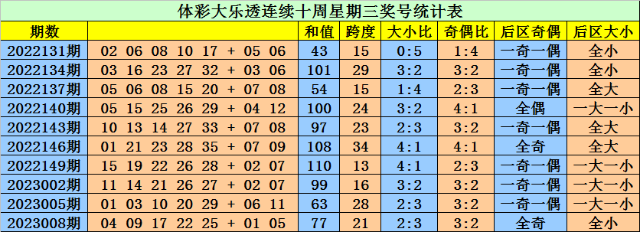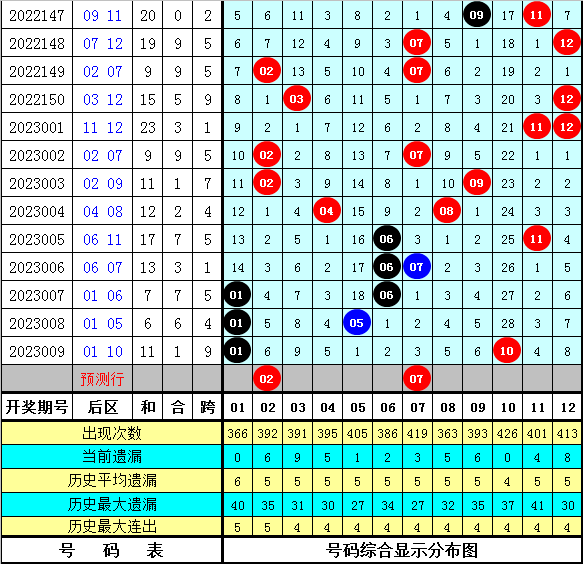 后区分析:最近10周星期三后区号码奇偶比为11:9,奇偶号码走势基本持平,号码大小比为10:10,大小号码开出比例基本持平,本期后区精选两码02和07。