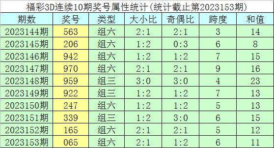 开奖回顾:福彩3D第2023153期奖号为065。奖号形态为组六,大小形态为小大大,奇偶形态为偶偶奇,和值为11,跨度为6。