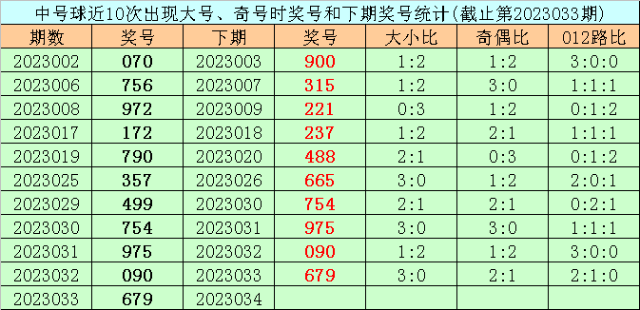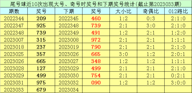 在尾号球前10次开出大号、奇号类型之后,其下期分别开出奖号:460、739、491、972、790、665、348、499、754、090,其中号码012路比为5:2:3,奇偶比为4:6,大小比为4:6。