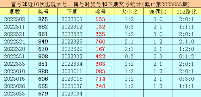 在首号球前10次开出大号、偶号类型之后,其下期分别开出奖号:533、132、335、760、167、422、383、083、714、348,其中号码奇偶比为8:2,大小比为3:7,012路比为4:5:1。