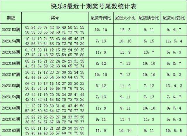 福彩快乐8第2023162期开奖回顾:03 06 11 15 21 28 29 30 33 37 39 40 44 48 55 57 60 70 75 80,其中奖号尾数奇偶比为11:9,尾数012路比为10:5:5,尾数大小比为10:10,尾数质合比为9:11。