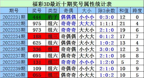 上期回顾:上期开奖奖号为055,类型:组三,偶奇奇,小大大,1:0:2,和值10,跨度5。