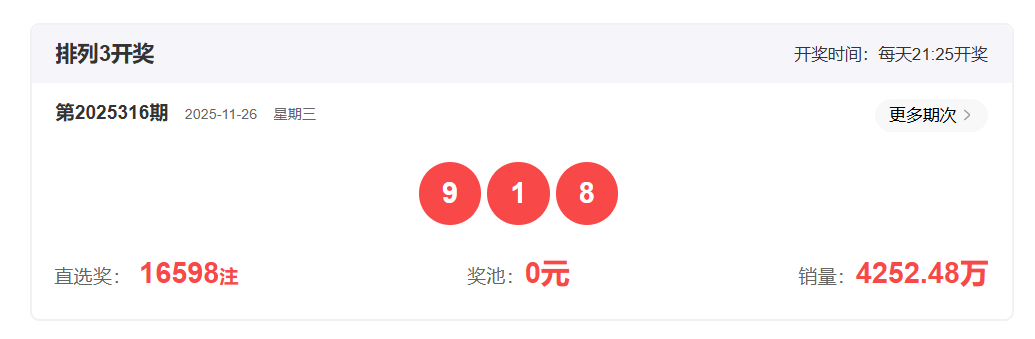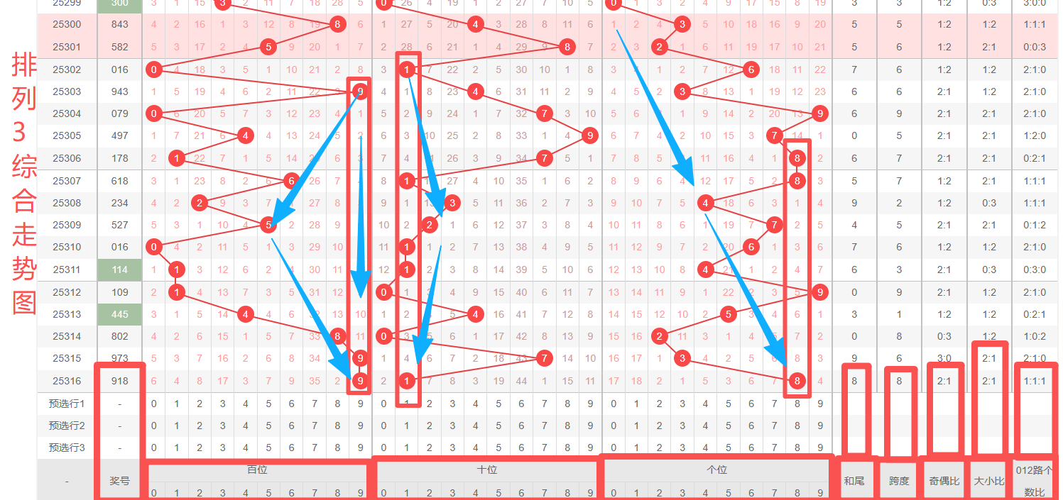 体彩排列3第2025316开奖号码918,形态为组六,奇偶比2:1,和值18,跨度7,大小比2:1,【012】路个数比1:1:1。