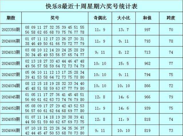 福彩快乐8第2024066期(上周六)开奖回顾:07 10 18 21 23 26 34 35 36 37 42 44 45 47 50 53 68 70 73 80,其中奖号和值为819,跨度为73,奇偶比为9:11,大小比为10:10。