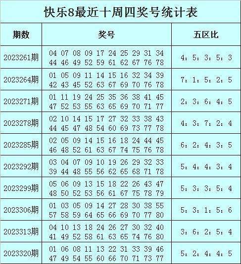 福彩快乐8第2023320期(上周四)开奖回顾:01 06 08 11 13 22 31 33 39 46 47 49 54 55 60 66 70 71 73 77,其中奖号五区比为5:2:4:4:5。