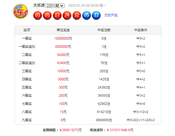大乐透第22011期开奖。当期开奖号码为:前区03 05 17 24 32,后区05 12。当期前区号码大小比为2:3,奇偶比为3:2,三区比2:2:1,前区没有开出重号和连号;后区开出小大组合05 12。