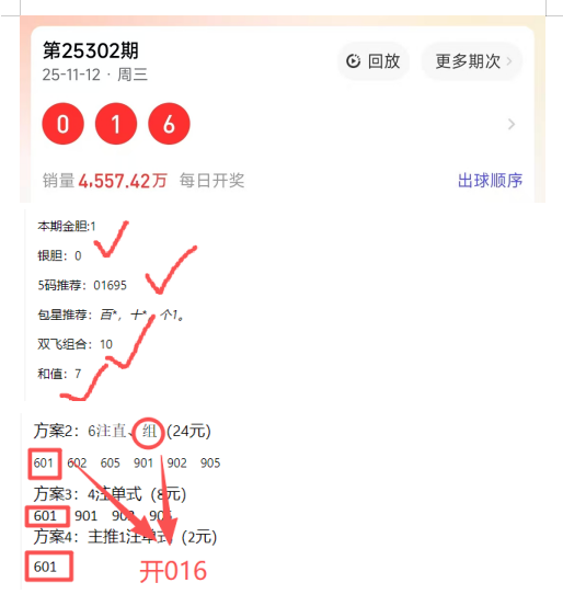 首先来看上期开奖号码为:016,和值为7.上期金银双胆都对,单挑一注中组六等