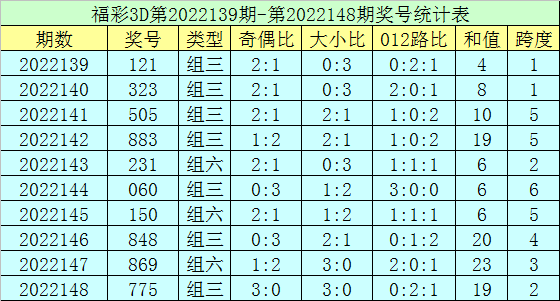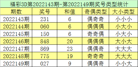福彩3D第2022149期回顾:奖号为027,奖号奇偶比为1:2,大小比为1:2,和值为9,类型为组六。