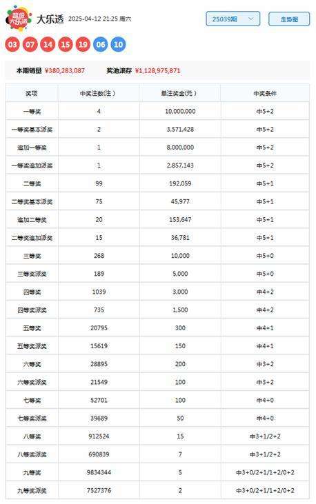 大乐透第2025039期开奖号码为:03、07、14、15、19+06 10。其中前区奖号三区比为2:3:0,奇偶比为4:1,包含1个重号:07,后区分布在二、三区。