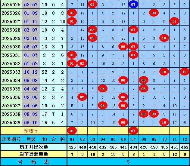 后区分析【一区01-04,二区05-08,三区09-12】:上期后区奖号为06和10,分别落在第二、三区,近50期后区三区比为36:32:32,近10期三区比为6:10:4,本期注意第一、二区号码出现,关注两码01+07。