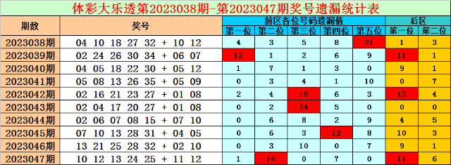 开奖回顾:第2023047期奖号:10 12 13 24 25 + 11 12 ,各位号码遗漏值分别为:1 16 0 7 0 + 11 6。前区开出3个热码:10 13 25,开出1个温码:24,开出1个冷码:12。后区开出1个温码+1个冷码组合。
