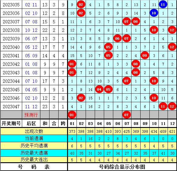 后区分析:上期出现1个温码和1个冷码11+12,后区目前有7个热码:02 04 05 07 10 11 12和4个温码:01 06 08 09,本期看好出现1个热码+1个温码组合,参考01+07。