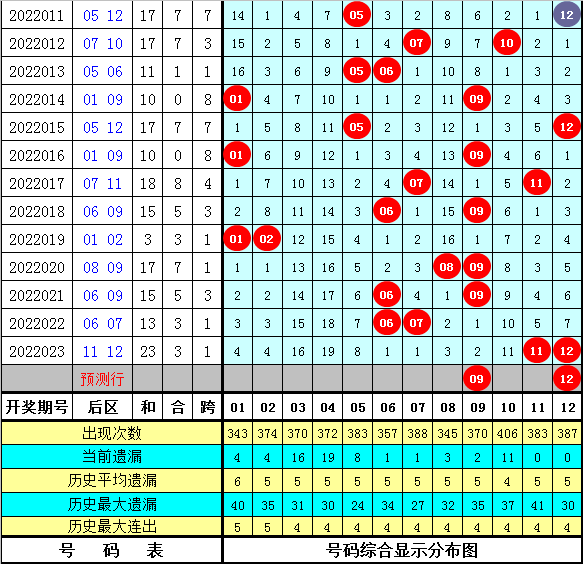 四、后区分析:在024期历史同期开奖中,后区全奇组合出现2次,全偶组合出现3次,一奇一偶组合出现10次;后区全大组合开出4次,全小组合开出3次,一大一小组合开出8次。本期后区看好大号热出,防全大开出,两码参考09、12。