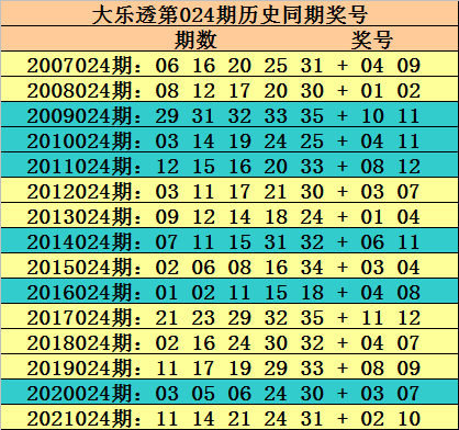 三、连号分析:在第024期历史同期奖号中只有6期出现了连号,分布在第2009024期、第2010024期、第2011024期、第2014024期、第2016024期、第2020024期,出现比例为40%,本期注意连号回补,关注连号11、12。