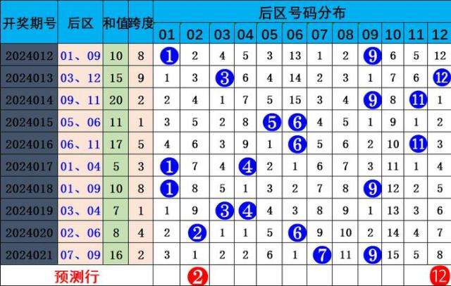 021期开出后区号码:07 09,冷热组合。冷热分析:近十期,冷热比6:14,冷号出号较冷,综合分析,本期预测热冷组合后区回补,关注号码02 05 08 10 12。精准推荐:02 12。