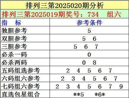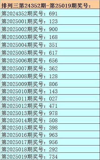 1。排列三最近十期分别开出号码:143-027-471-978-508-398-963-956-292-734,其中有7期奖号开出了上期的重复号码,本期预计第2025019期奖号:734中有重号,参考号码:7。