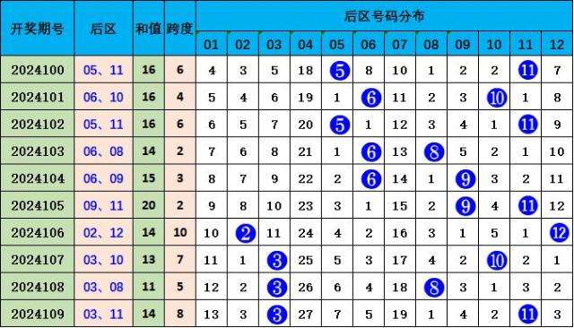 后区分析:上期后区开出03 11,和值14,跨度8,本期预计和值有上升趋势,预计本期开出号码07 09,和值16,跨度2。