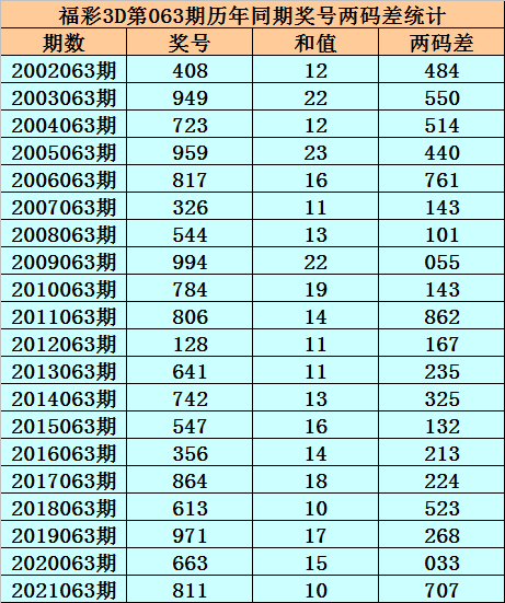 福彩3D第063期,历史上期开出20次奖号,其奖号分别为:408、949、723、959、817、326、544、994、784、806、128、641、742、547、356、864、613、971、663、811,奖号两码合差分别开出: