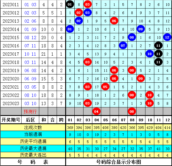 在历史同期开奖中,后区号码和值奇偶为11:5,其中偶号和值开出比例较低,本期注意偶号和值逐渐回补,关注和值12。