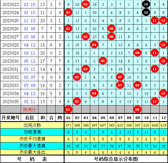后区分析:后区上期开出号码02+11,和值为13,跨度为9。最近10区后一区(01-06)开出10个号码,断区2次,后二区(07-12)开出10个号码,断区2次,本期后一区注意号码:01、03、06;后二区注意号码:08、09、10。