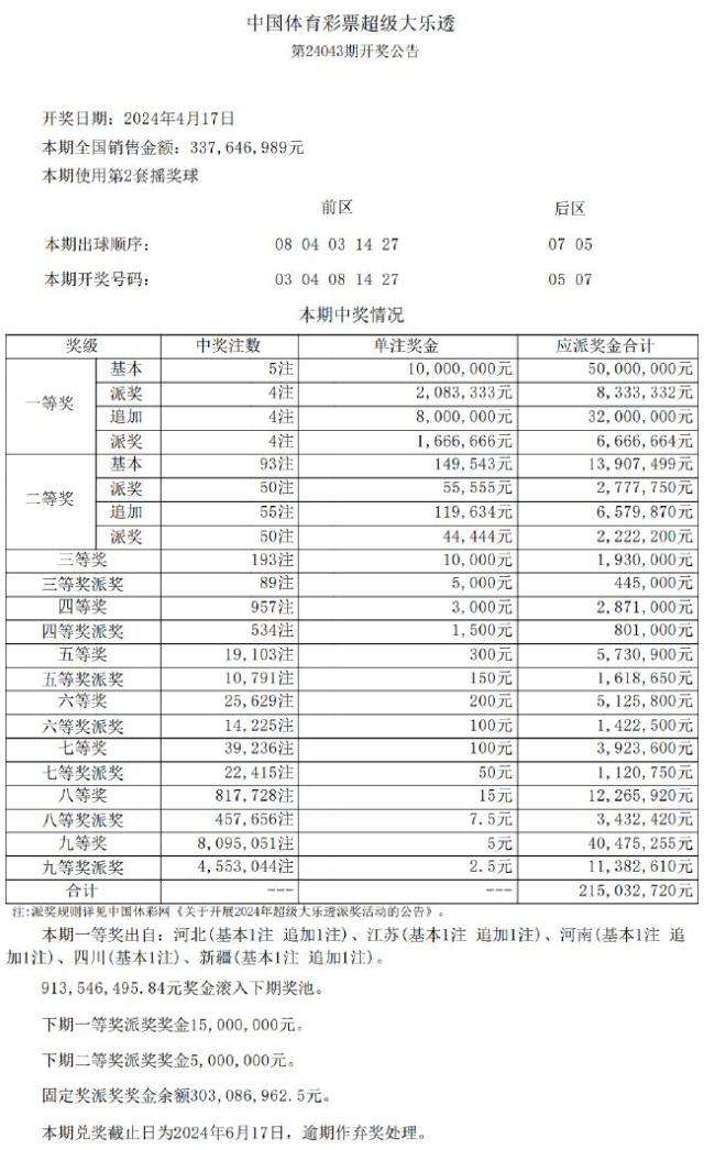 北京时间4月17日晚,体彩超级大乐透第24043期开奖,同时本期也是大乐透10亿大派奖的第14期。当期开奖号码为前区03 04 08 14 27,后区05 07。