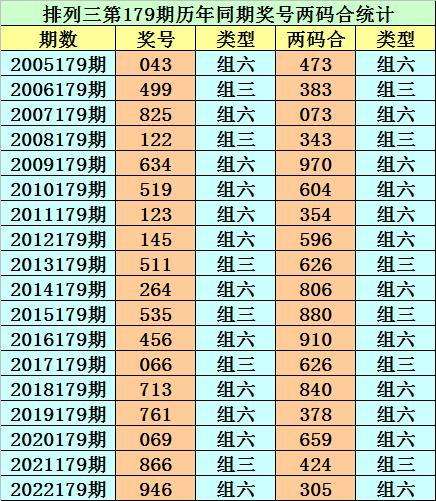 在历年同期中两码合开出年限分别为:0出现8年,3出现7年,4、6出现6年,8出现5年,5、7、9出现4年,2出现3年,1出现1年,第2023179期预计两码合出现:0、5、9。
