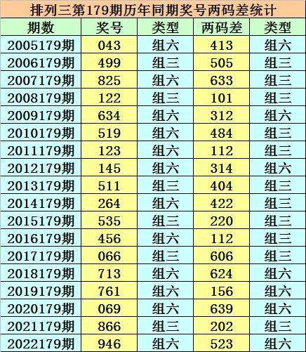 在历年开奖中,两码差开出年限分别为:2出现8年,1出现7年,0、3、4出现6年,6出现5年,5出现3年,8、9出现1年,7出现0年,第2023179期预计两码差出现:1、4、5。