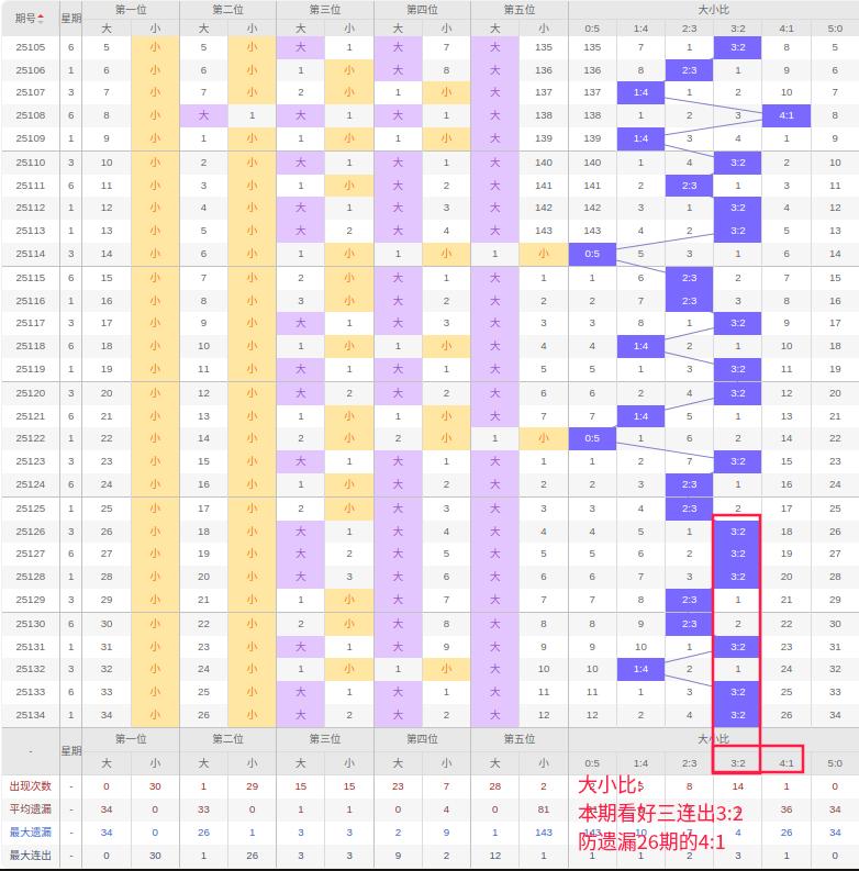 上期大小比:3:2,近10期大小比出现情况:2:3、3:2、3:2、3:2、2:3、2:3、3:2、1:4、3:2、3:2,最近10期出现6期3:2,出现3期2:3,出现0期4:1,出现1期1:4,出现0期5:0,出现0期0:5,根据近10期规律本期看好三连出3:2,防遗漏26期的4:1,综上所述推荐大小比推荐:4:1,重点关注:3:2。