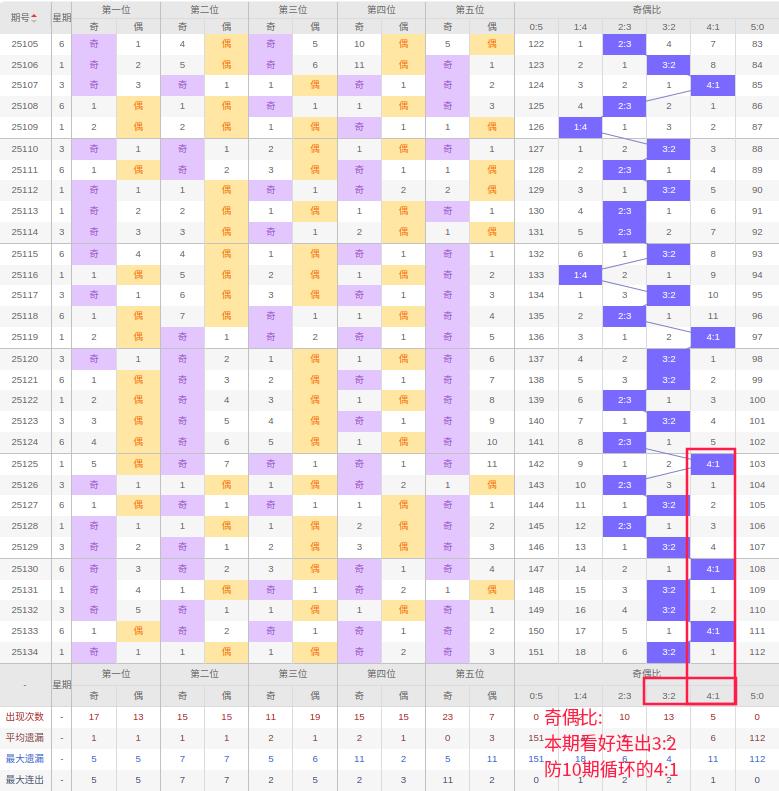 上期奇偶比:3:2,近10期奇偶比出现情况:4:1、2:3、3:2、2:3、3:2、4:1、3:2、3:2、4:1、3:2,最近10期出现5期3:2,出现2期2:3,出现3期4:1,出现0期1:4,出现0期5:0,出现0期0:5,根据近10期规律本期看好连出3:2,防10期循环的4:1,综上所述推荐奇偶比推荐:4:1,重点关注:3:2。