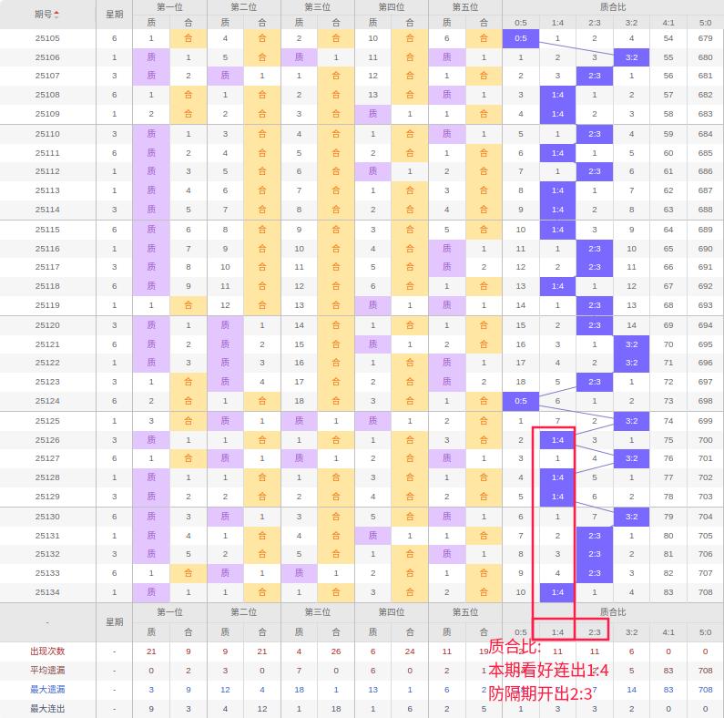 上期质合比:1:4,近10期质合比出现情况:3:2、1:4、3:2、1:4、1:4、3:2、2:3、2:3、2:3、1:4,最近10期出现4期3:2,出现2期2:3,出现0期4:1,出现4期1:4,出现0期5:0,出现0期0:5,根据近10期规律本期看四连出1:4,防隔期的2:3,综上所述推荐质合比推荐:2:3,重点关注:1:4。