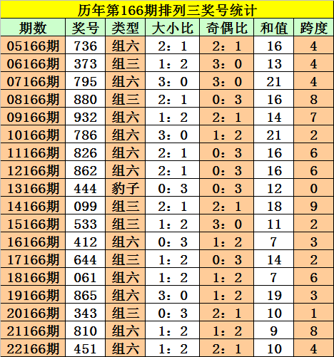 排列三第2022166期奖号:451,和值10,跨度4,大小比1:2,奇偶比2:1。