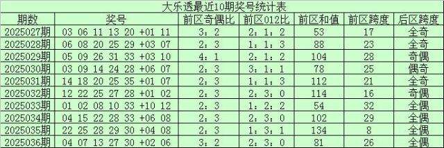 大乐透第2025036期开奖,前区:04、07、13、27、30;后区:02、06。其中前区和值为81,跨度为26,012路比为2:3:0,奇偶比为3:2,后区开出全偶、2路+0路组合。