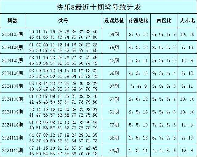 福彩快乐8第2024112期开奖回顾:07 11 15 19 21 29 35 37 42 45 46 50 54 55 67 68 69 70 76 78,其中奖号遗漏总值为47,冷温热码比为1:8:11,四区比为4:4:6:6。