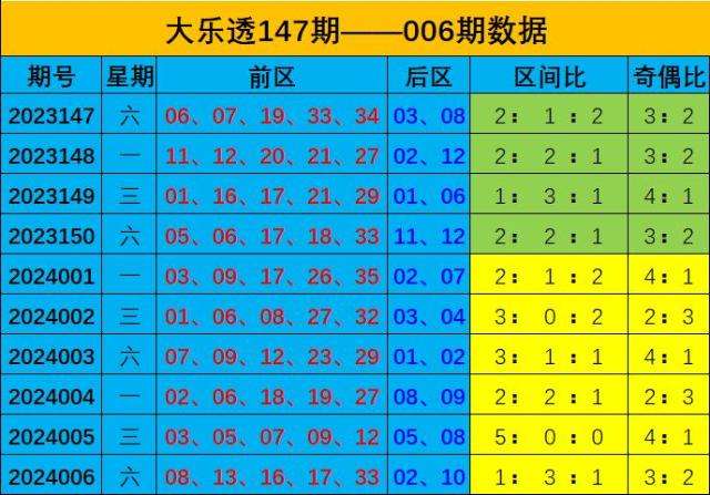 大乐透第2024006期出奖号统计:前区08 13 16 17 33,后区02、10,和值为87,跨度25,龙头08凤尾33,三区比为1:3:1,012路比为1:2:2,奇偶比为3:2,大小比为1:4,冷热比为3:2,0枚重号,1组连号。